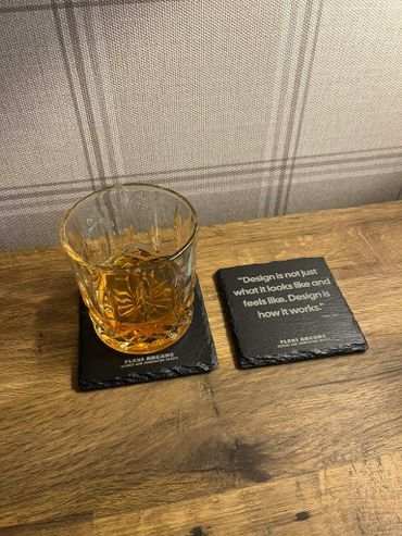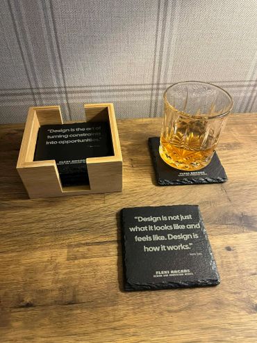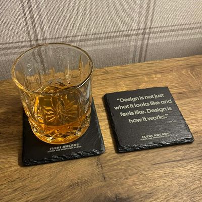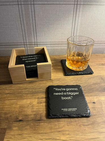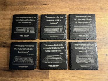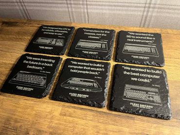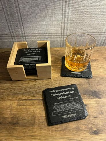 A collection of retro-inspired slate coasters, designed and laser engraved in-house, featuring clean designs and subtle nods to classic computing, gaming, and pop culture.