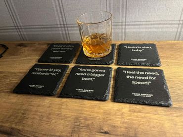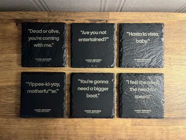 Iconic lines from classic films, reimagined as clean, engraved designs — instantly recognisable and perfect for everyday use or display.